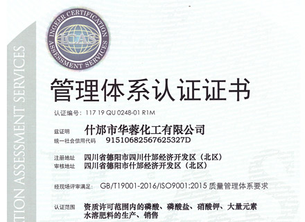 什邡市華蓉化工有限公司原名什邡華蓉科技有限責(zé)任公司,位于磷礦資源豐富的四川省什邡市,距成都60公里,交通運(yùn)輸便利,是一家專業(yè)生產(chǎn)、研發(fā)精細(xì)磷化工系列產(chǎn)品的大型生產(chǎn)企業(yè)。生產(chǎn)設(shè)備先進(jìn),技術(shù)研發(fā)團(tuán)隊(duì)強(qiáng)大,現(xiàn)公司占地面積約30000平方米,擁有5條生產(chǎn)線,主要生產(chǎn)大量元素水溶肥、磷酸二氫鉀、磷酸二氫銨、磷酸氫二銨、硝酸鉀、磷酸脲以及磷酸,年總產(chǎn)量為100000噸以上。公司資質(zhì)齊全,管理規(guī)范,已取得安全生產(chǎn)許可證、ISO9001:2015質(zhì)量管理體系認(rèn)證、食品生產(chǎn)許可證、工業(yè)產(chǎn)品生產(chǎn)許可證、自營進(jìn)出口經(jīng)營權(quán)進(jìn)出口證書以及出口歐盟國家部分產(chǎn)品的REACH證書。